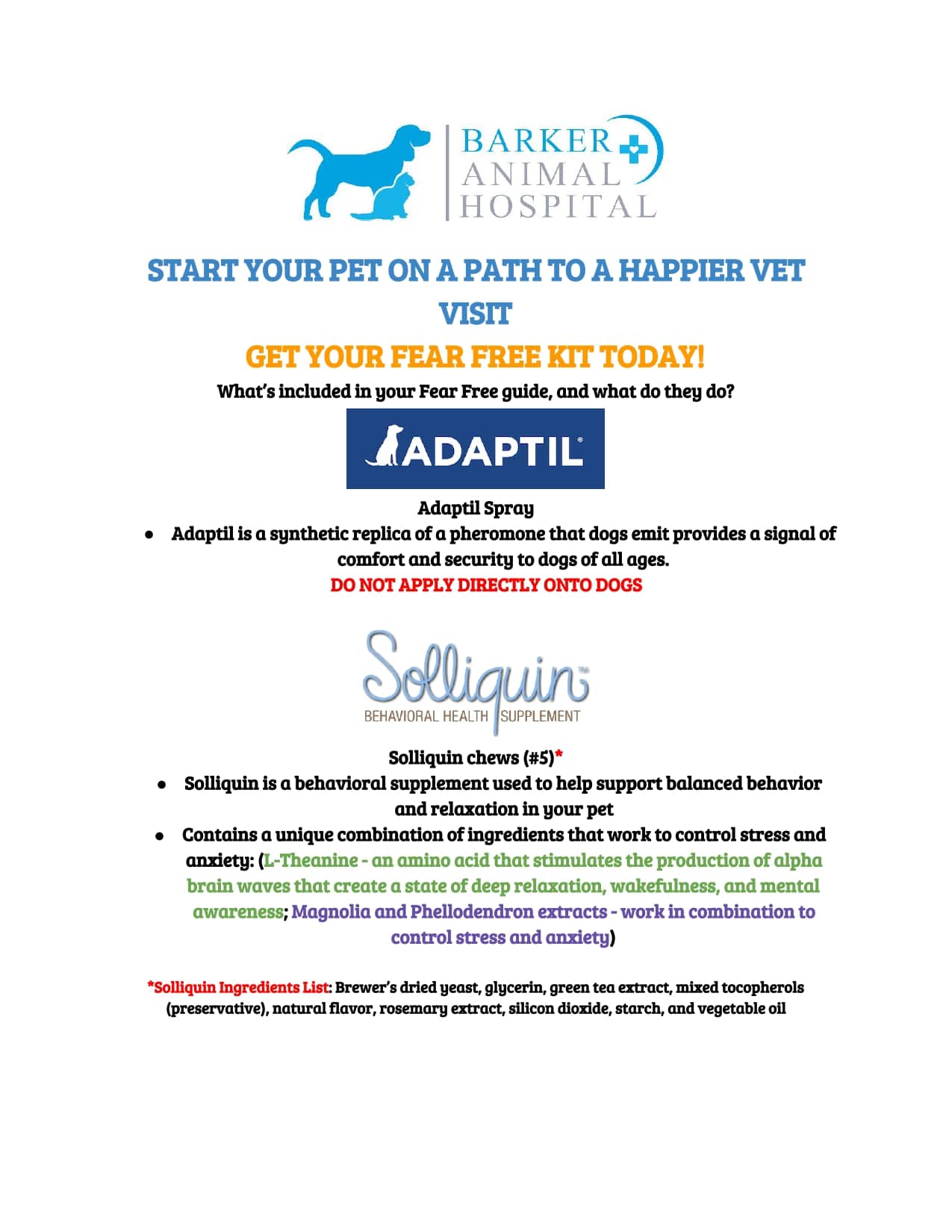 Solliquin: A supplement that promotes normal behavior and facilitates a calming effect without sedation. A size and species-appropriate dose are included in our Fear Free Visit Kit as well.