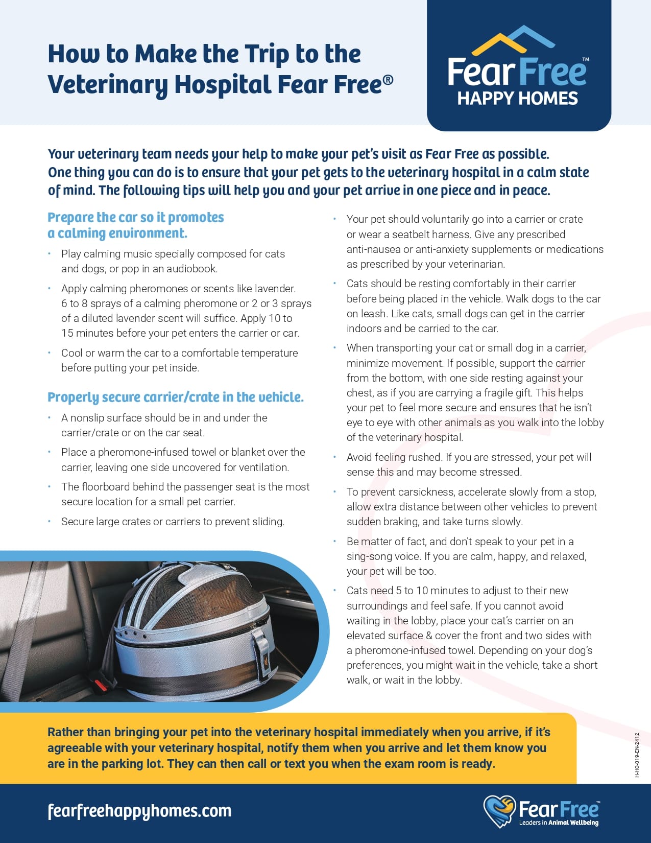 Our Fear Free Visit Kit includes Feliway wipes for cats (to be used on carrier/car surfaces) and a sample of Adaptil spray for dogs, which can be applied to a bandana and tied around a pet’s neck or sprayed onto clothing/car surfaces.